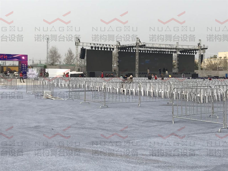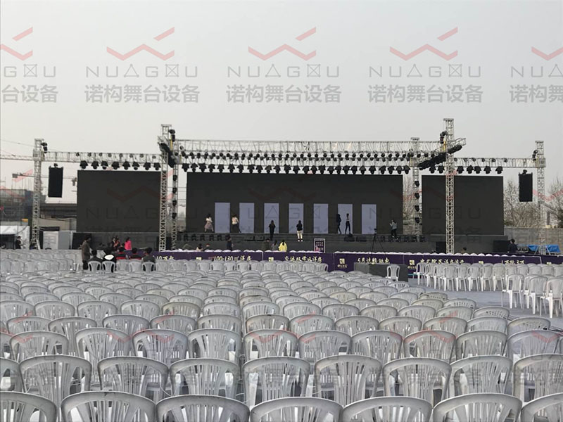 立柱采用400*400加强型铝架,横梁采用520*760加强型桁架,整套搭建尺寸6+20+6*深度12M*高12M,整套载重为4.5吨。