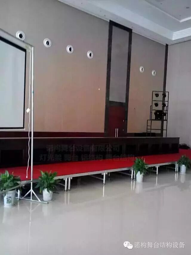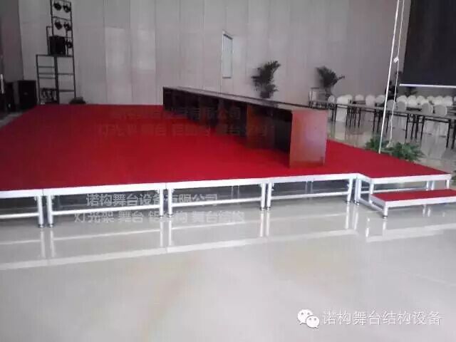整批舞台采用全铝结构,配上专业舞台木板,具有防滑,防潮的特点。初来看上去并没有什么特别的地方。下面在看看舞台到了现场经过工程人员的安装修饰后的效果: